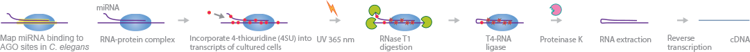 Argonaute – crosslinking and immunoprecipitation (AGO-CLIP ) is a protocol that maps miRNA binding to AGO sites in C. elegans. In this method, photoreactive nucleoside 4-thiouridine (4SU) is first incorporated into C.elegans RNA in vivo. The 4SU labeled RNA is crosslinked to bound protein. The extracted lysate is treated with RNase T1, which shortens some miRNAs. After immunoprecipitation and washing, crosslinked RNA is treated with PNK, T4-Ligase and finally proteinase K. The RNA is lastly extracted, reverse transcribed to cDNA and sequenced. Deep sequencing provides single base pair resolution of miRNA and AGO binding sites.