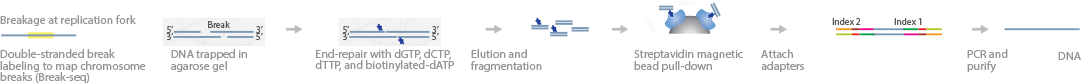 Break-seq combines DSB labeling with NGS to map chromosome breaks with improved sensitivity and resolution. DNA trapped in agarose plugs is end-repaired and labeled with biotin. The agarose is then digested by beta-agarase, followed by dilution and fragmentation. The fragmented DNA is purified and end-repaired with unmodified dNTPs, followed by A-tailing. The fragments are purified on magnetic beads, PCR-amplified, purified, and used to prepare a sequencing library.