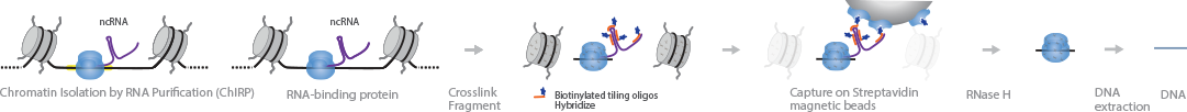 Chromatin isolation by RNA purification (ChIRP-Seq) is a protocol that detects the locations on the genome where non-coding RNAs (ncRNAs), such as long non-coding RNAs (lncRNAs), and their proteins are bound . In this method, samples are first crosslinked and sonicated. Biotinylated tiling oligos are hybridized to the RNAs of interest, and the complexes are captured with streptavidin magnetic beads. After treatment with RNase H the DNA is extracted and sequenced. With deep sequencing the lncRNA/protein interaction site can be determined at single-base resolution.