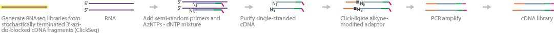 ClickSeq is an RNA sequencing technique that uses bioconjugation, as an alternative to fragmentation, in the library preparation step to produce lower error rates than standard sequencing methods. First, RNA is reverse transcribed into cDNA, in a process similar to Sanger sequencing, with 3'-azido-2',3'dideoxynucleotides (AzNTPs). This induces chain termination and semi-random primers (6 random nucleotides followed by an Illumina 3' adapter (P7) to sequence random positions on the RNA template. Single-stranded cDNA are then purified and their 3'-ends click-ligated with alkyne-modified (5'hexynyl) P5 adapters. After PCR amplification, the cDNA library is ready to be sequenced.