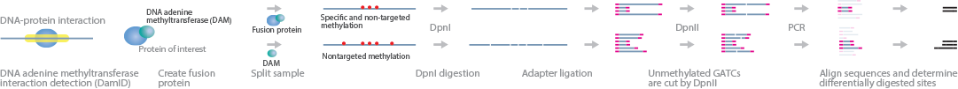 DamID allows the identification of protein-binding sites in living cells without the need for crosslinking or immunoprecipitation. It was developed in 2006 as a microarray method before it was adapted to NGS. DamID involves the low-level expression of a fusion protein consisting of DNA adenine methyltransferase (Dam) and a chromatin protein of interest. This fusion protein is targeted to the native binding sites of the chromatin protein, where Dam methylates adenines in the surrounding DNA. Subsequently, the methylated DNA fragments are isolated, amplified by selective PCR, and sequenced.