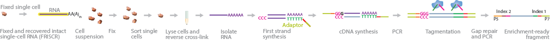 FRISCR characterizes transcriptome profiles from fixed and stained single cells. The method uses a combination of molecular barcodes and Tn5 tagmentation to identify each cDNA fragment uniquely from every cell.