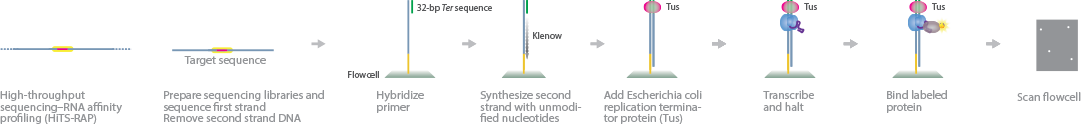 First, sequencing libraries are prepared and sequenced on the Illumina flow cell. Next, the second strand of the DNA is removed and the single-stranded DNA attached to the flow cell is annealed to primers containing a 32 bp Ter sequence. An Escherichia coli replication terminator protein (Tus) is introduced into the system and binds to the Ter sequence. RNA transcription by T7 RNA polymerase begins and halts upstream of the Tus-bound Ter site. Because the RNA polymerase activity was halted abruptly due to the Tus bound to the DNA, the RNA strand is still linked to the RNA polymerase complex. Fluorescently labeled proteins are introduced and bind to the exposed RNA aptamers, producing a fluorescent signal that can be read by the sequencer.