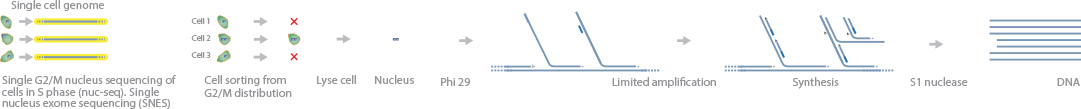 Nuc-seq is a modified MDA protocol that takes advantage of the fact that a single cell in the G2–M stage of the cell cycle has four copies of the genome, which allows the cells to be isolated with a cell sorter and it also significantly increases the genome coverage of single cells. SNES, single nucleotide exome sequencing, is an additional variation that includes targeted selection and sequencing of the exomes.