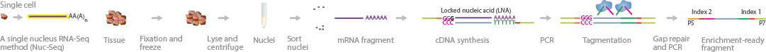 Nuc-Seq is an RNA sequencing technique optimized for isolating and sequencing nuclear RNA from frozen tissue samples. Nuc-Seq avoids proteolytic treatment during nuclei dissociation from cells, minimizing gene expression changes resulting from common protease dissociation procedures; this step is similar to the one used in snRNA-seq. Next, Smart-seq2 is used for cDNA synthesis, increasing the full-length cDNA yield due to its template-switching mechanism. Finally, the sequencing library is prepared using Tn5 transposase tagmentation.