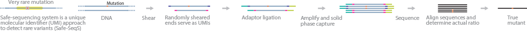 Safe-Seq assigns a unique identifier (UMI) to each template molecule and amplifies each uniquely tagged template molecule to create UMI families. The abundance of each UMI can be used to distinguish between rare mutations and technical errors and it can also be used to correct for PCR amplification bias.