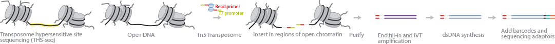 Transposome hypersensitive sites sequencing assay for highly sensitive characterization of chromatin accessibility (THS-seq). This variation on ATAC-Seq uses linear amplification of accessible DNA ends, in vitro transcription and an engineered Tn5 super-mutant.