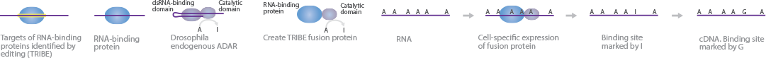 TRIBE identifies the target RNA sequences of RBPs in vivo by modifying the RNA sequence using fusion proteins. The fusion protein consists of the RBP of interest, which binds to the target RNA, and the catalytic domain of adenosine deaminase acting on RNA (ADAR), which irreversibly modifies the proximal adenosine to inosine to serve as a marker during sequence analysis.